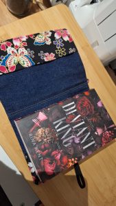 Ici j’ai utilisé du tissu japonais, ainsi que des chutes de denim, afin de rendre la protection plus solide et à l’épreuve des sollicitations extérieures : le sac à main, ou à dos, les voyages en voiture, etc…