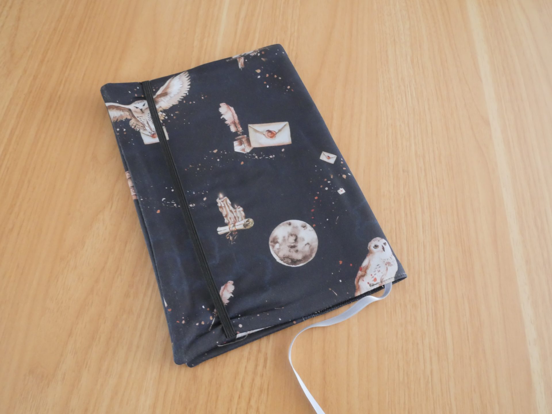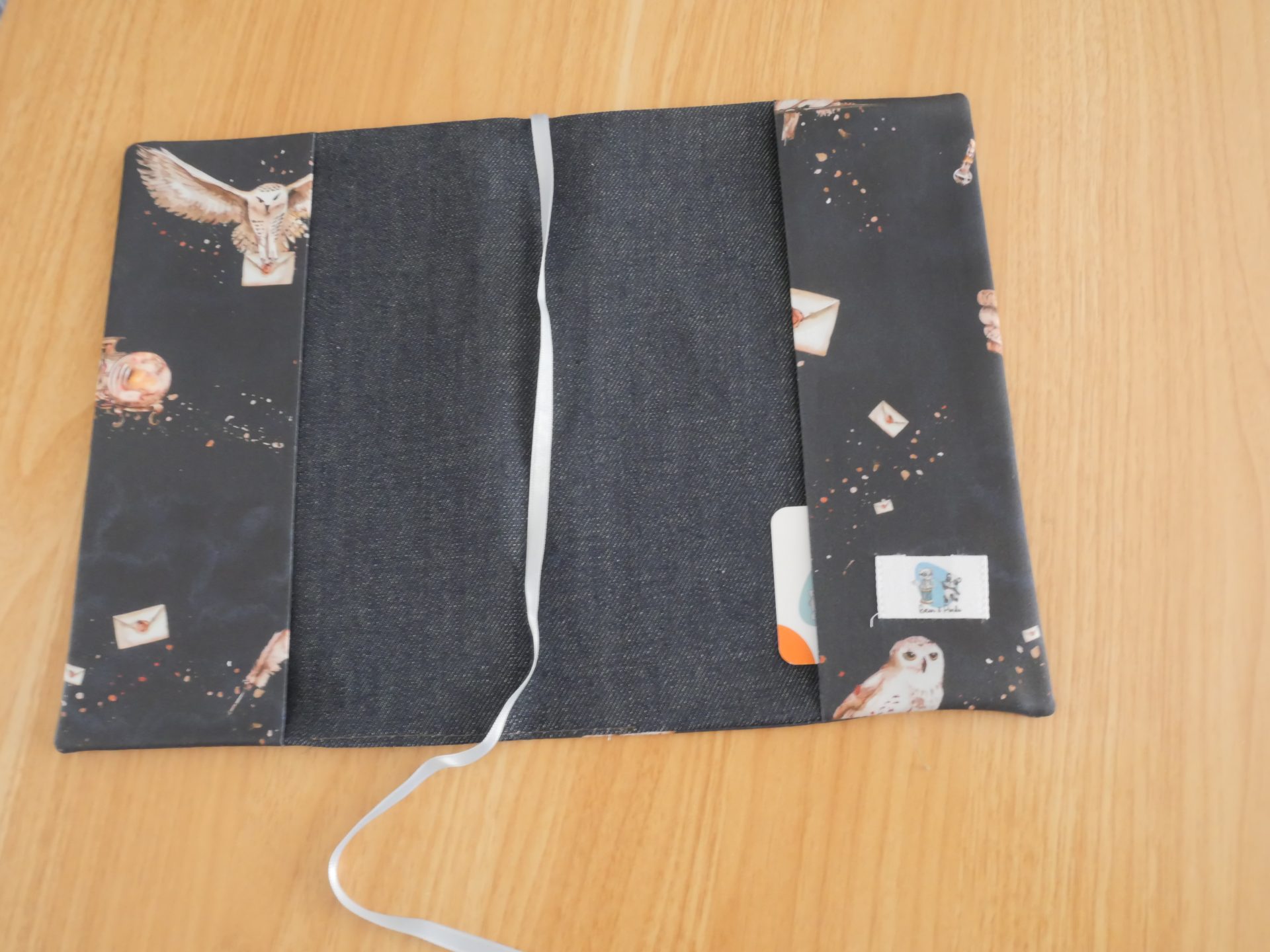 Couvre-livre « Book Lover » cousu main — tissu noir illustré chouettes, plumes et lune, doublure jean brut, élastique de fermeture, marque-page satin et poche intérieure. Pour les lectrices aux âmes de sorcières ! 🦉✂️